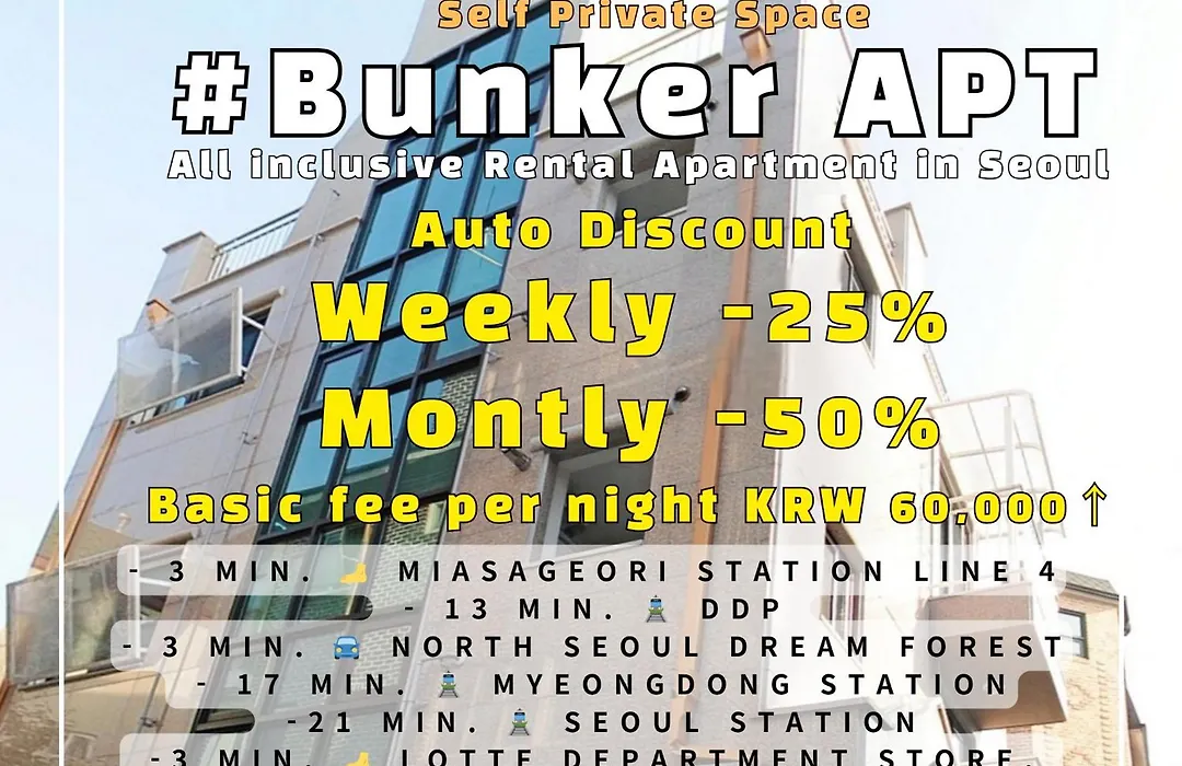 Seoul Rental Apartment Fully Furnished #Bunker Apt, Near Miasageori Subway Station Line 4 med 6 rum ligger 6 km från Changdokkung och erbjuder närhet till tågstationen Seoul, som ligger cirka 20 minuters bilfärd bort.